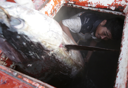 A yellow fin tuna is unloaded from the hold of a fishing boat at fish at a port in General Santos City, Mindanao, southern Philippines January 10, 2008. [Agencies]