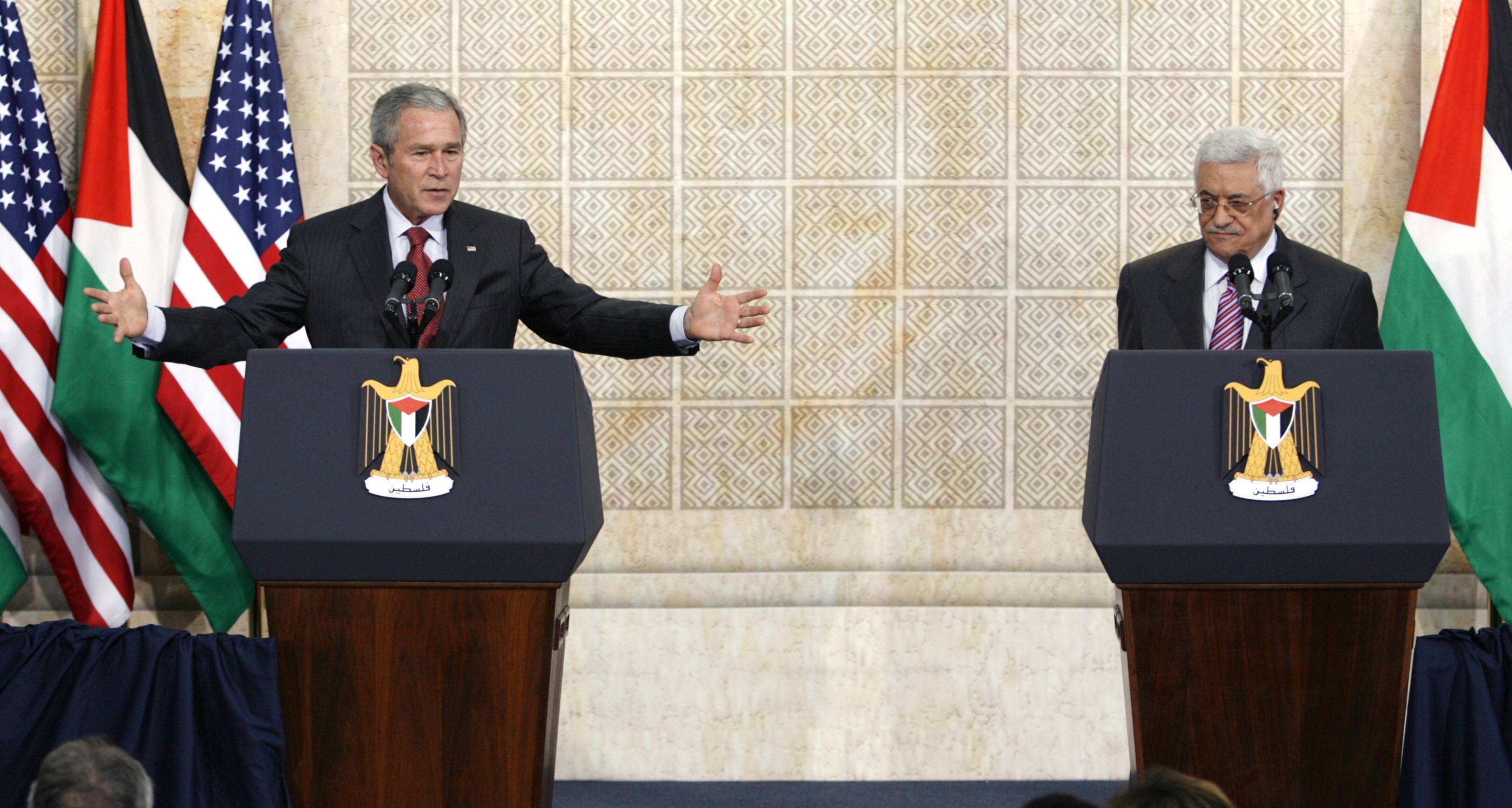 | U.S. President George W. Bush and Palestinian President Mahmoud Abbas speak to reporters following their meeting at the Muqata presidential compound in the West Bank city of Ramallah January 10, 2008. Bush faces a balancing act in West Bank talks with Abbas on the second day of a Middle East peace mission laden with scepticism. [Agencies] |