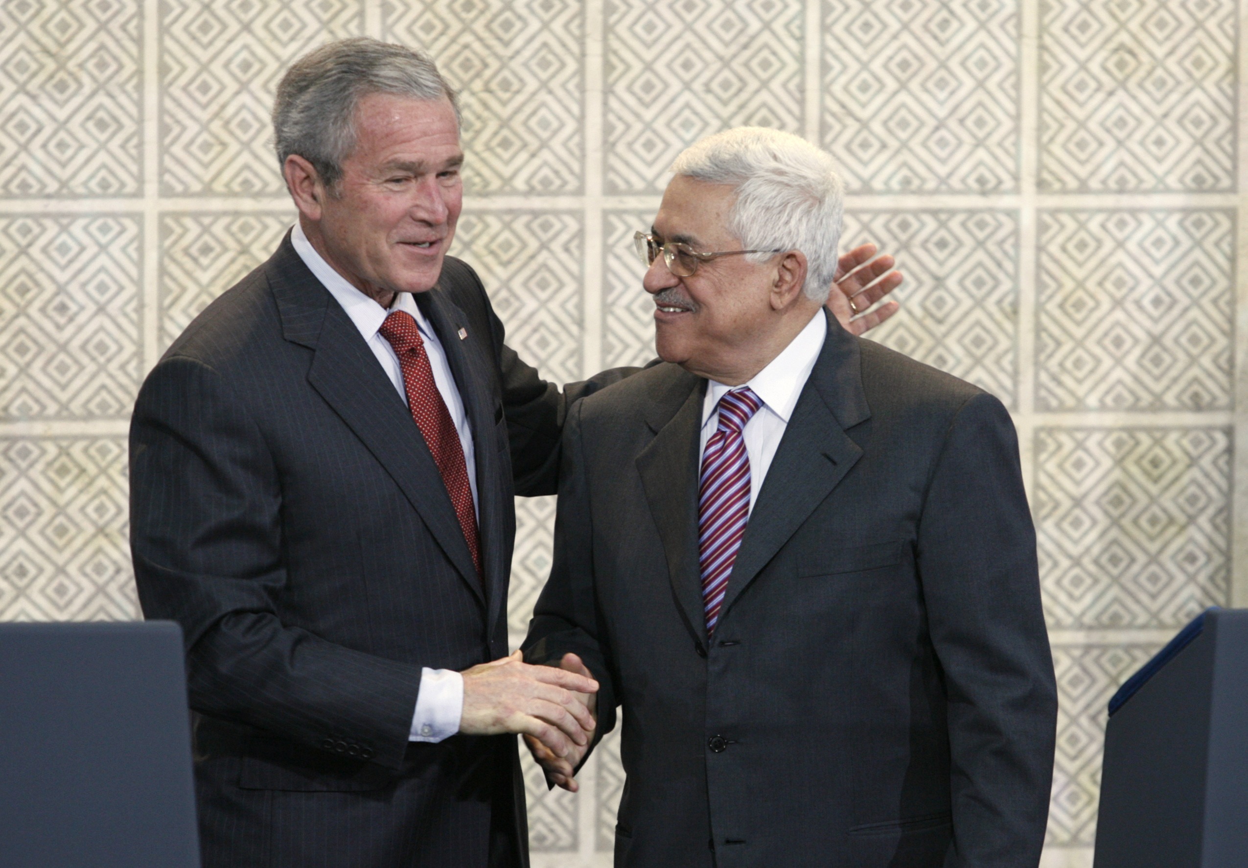 | U.S. President George W. Bush (L) and Palestinian President Mahmoud Abbas leave after a joint news conference at the Palestinian Authority headquarters in the West Bank city of Ramallah January 10, 2008. [Agencies] |