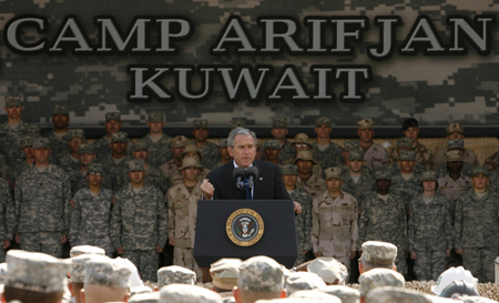 US President George W. Bush speaks to US soldiers based at Camp Arifjan in Kuwait January 12, 2008. [Agencies]