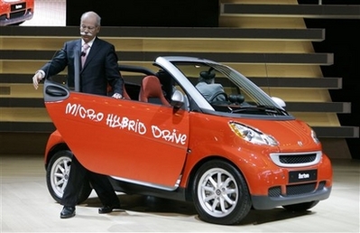 Dr. Dieter Zetsche, Chairman of the Board of Management of Daimler AG and head of Mercedes-Benz Cars, gets out of the Smart Fortwo at the North American International Auto Show Sunday, Jan. 13, 2008 in Detroit. [Agencies]