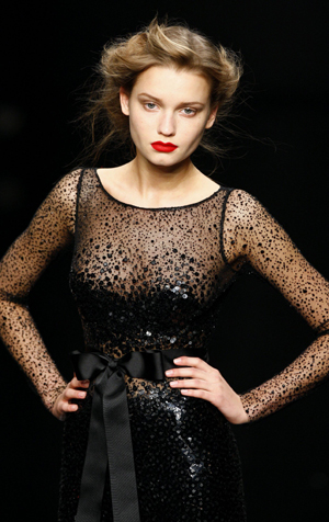 A model displays a creation by Jenny Packham during her Autumn/Winter 2008 show at London Fashion Week February 14, 2008. [Agencies]