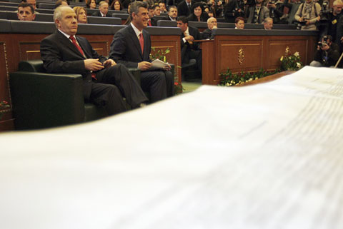Behind a declaration of independence, Kosovo Prime Minister Hashim Thaci (R) and Kosovo President Fatmir Sejdiu react during a parliament session in Pristina February 17, 2008. [Agencies]