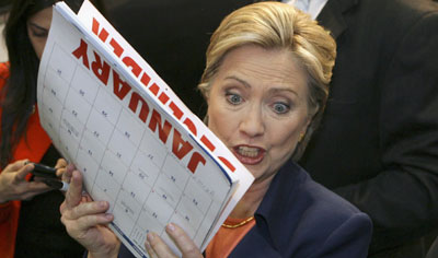 Democratic presidential candidate Senator Hillary Clinton (D-NY) holds a calendar that she was handed from the crowd to autograph at her Wisconsin primary election night campaign rally in Youngstown, Ohio February 19, 2008. [Agencies]