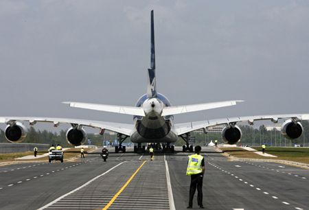 Security personnel and aviation staff escort an Airbus A380 superjumbo as it is towed down a road towards a runway at the Singapore Air Show February 20, 2008. [Agencies]