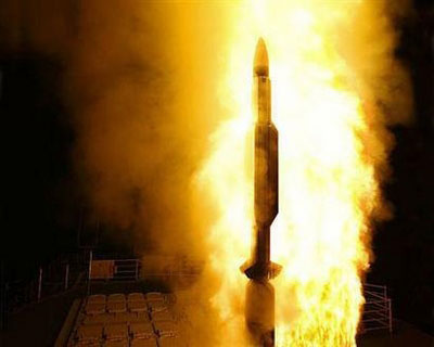 A Standard Missile-3 (SM-3) is launched from a guided-missile cruiser in an image courtesy of the US Navy. A missile fired from a US Navy warship hit a defunct spy satellite in space to try to prevent its toxic fuel tank from crashing to Earth, the Pentagon said on Wednesday. [Agencies]