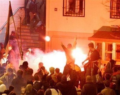The embassy said a charred body was found in the embassy after the attack. "It was found at the part of the building set on fire by the protesters," embassy spokeswoman Rian Harris said. She said all embassy staffers were accounted for; Belgrade's Pink TV said the body appeared to be that of a rioter. Masked attackers broke into the US compound, which was closed at the time, just after 7 p.m. and tried to throw furniture from an office. They set fire to the office and flames shot up the side of the building. It took police about 45 minutes to appear at the scene, and firefighters arrived about the same time and put out the blaze. Police secured the US Embassy and surrounding area, blocking off all access. The US Ambassador to the United Nations, Zalmay Khalilzad, said he was "outraged" by the attack and would ask the UN Security Council to issue a unanimous statement "expressing the council's outrage, condemning the attack, and also reminding the Serb government of its responsibility to protect diplomatic facilities." Serbia's President Boris Tadic, on an official visit to Romania, appealed for calm and urged the protesters to stop the attacks and move away from the streets. Tadic said that violence was "damaging" Serbia's efforts to defend Kosovo, which declared its independence from Belgrade on Sunday. For several days, Kosovo's Serbs have shown their anger by destroying UN and NATO property, setting off small bombs and staging noisy rallies. On Thursday, the neighboring Croatian Embassy also was targeted by the same group of protesters at the US Embassy, and smaller groups attacked police posts outside the Turkish and British embassies in another part of the city but were beaten back. Elite police paramilitaries drove armored jeeps down the street outside the US Embassy and fired dozens of tear gas canisters to clear crowds. The protesters fled into side streets where they continued clashing with the police. Groups also broke into a McDonald's restaurant and demolished the interior. A number of other shops were also ransacked and people were seen carrying off running shoes, track suits and other sporting goods from a department store. Doctors at Belgrade's emergency clinic reported treating more than 30 injured, half of whom were policemen. All were lightly injured, said Dusan Jovanovic, deputy chief of the clinic, adding that most of the injured protesters were "extremely drunk." |