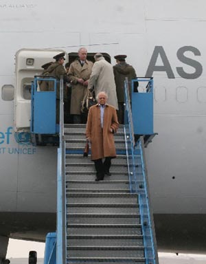 Lorin Maazel (C), music conductor of the New York Philharmonic, walks out of a plane at an airport in Pyongyang, capital of the Democratic People's Republic of Korea (DPRK), Feb. 25, 2008. The New York Philharmonic arrived here Monday and its concert slated for Tuesday will be the first by a US symphony orchestra in the DPRK. [Xinhua]