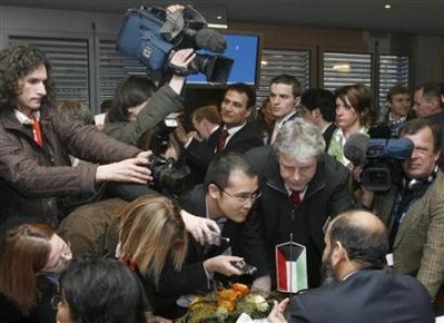 Journalists face Acting Kuwaiti Oil Minister Mohammad al-Olaim (R) at the beginning of a meeting in OPEC's headquarters in Vienna March 5, 2008. [Agencies]