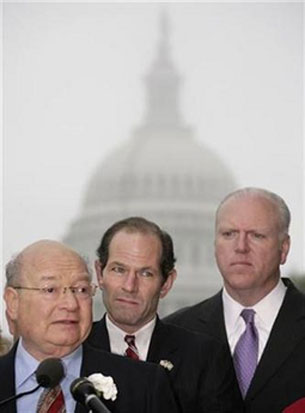 New York Governor Eliot Spitzer and Rep. Joseph Crowley listen as Rep. Gary Ackerman speaks during a news conference November 14, 2007 on Capitol Hill in Washington about Spitzer's controversial plan to issue driver's licenses to illegal immigrants. [Agencies] NY governor quits