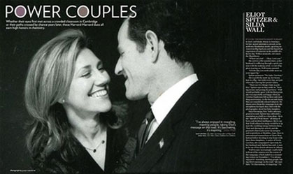 This photo from the Winter 2007 magazine article titled 'Power Couples' and provided by 02138, a publication that focuses on Harvard University alumni, shows Gov. Eliot Spitzer and his wife Silda. Spitzer resigned as governor Wednesday morning March 12, 2008, in the midst of a prostitution scandal. [Agencies] NY first lady's charmed life slips away