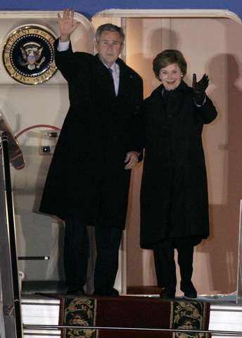 US President George W. Bush and first lady Laura Bush arrive at Borispol airport outside Kiev, March 31, 2008. He is to start his two-day state visit to Ukraine. [Agencies]