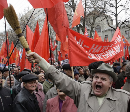 Protestors hold a protest against US President George W. Bush's visit to Ukraine in front of the American embassy in Kiev, March 31, 2008. [Agencies]