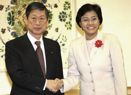 Indonesian Finance Minister Sri Muluyani Indrawati (R) shakes hands with Japanese Foreign Minister Masahiko Komura prior to the Outreach Session of the G8 Development Ministers' Meeting in Tokyo April 5, 2008. [Agencies]