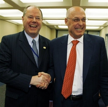 US Treasury Secretary Henry M. Paulson shake hands with Finance Minister of Germany Peer Steinbruck during a bilateral meeting at International Monetary Found in Washington Saturday, April 12, 2008. [Agencies]