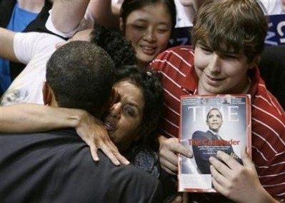 Democratic presidential candidate Senator Barack Obama (D-IL) gets a hug from a supporter at his Pennsylvania primary election night rally in Evansville, Indiana, April 22, 2008. Indiana will hold one of the next Democratic primary elections on May 6. [Agencies]