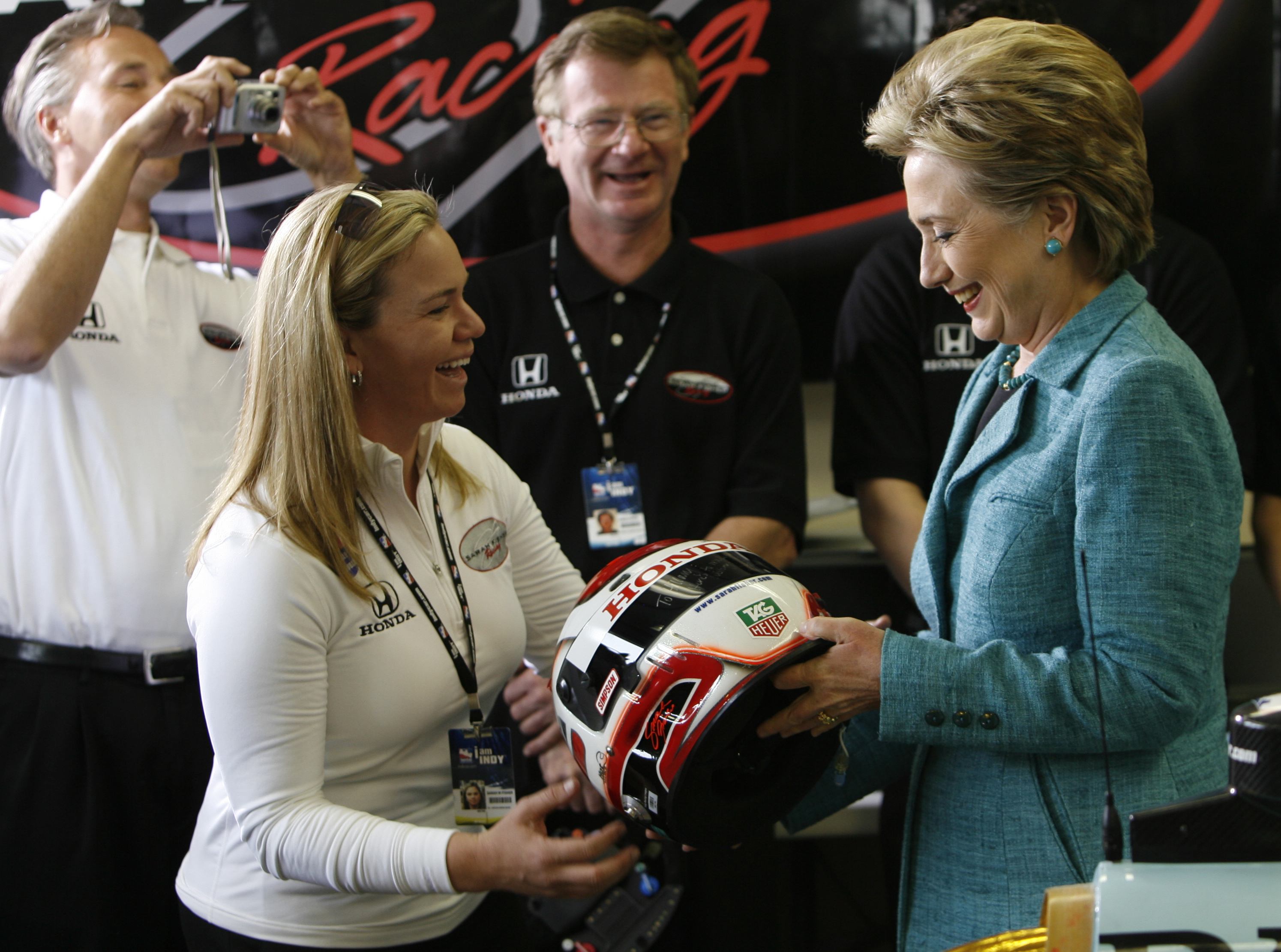 | US Democratic presidential candidate Hillary Clinton (D-NY) is presented with a helmet by race car driver Sarah Fisher as they stand next to her car at the Indianapolis Motor Speedway in Speedway, Indiana May 6, 2008. [Agencies] |