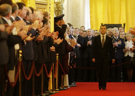 Dmitry Medvedev enters the hall for the inauguration ceremony in the Kremlin throne room in Moscow, May 7, 2008. Medvedev was sworn in as Russian president on Wednesday and just over two hours later nominated his predecessor Vladimir Putin as prime minister, ushering in an unprecedented period of dual rule. [Agencies]