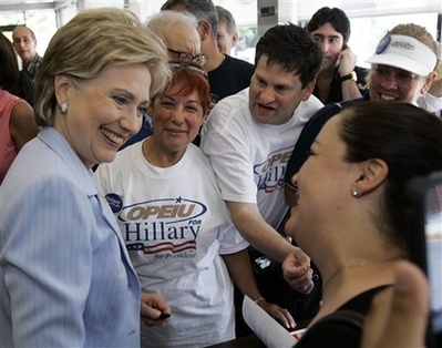 US Democratic presidential hopeful Sen. Hillary Rodham Clinton, D-N.Y., chats with supporters at the Kaslata Bakery in San Juan, as she campaigns on primary day in Puerto Rico, Sunday, June 1, 2008. [Agencies]