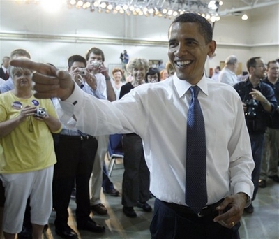 Democratic presidential hopeful, Sen. Barack Obama D-Ill., reacts to the crowd during a gathering of veterans and military families in the armory at the W. H. Lyon Fairgrounds Sioux Falls, S.D., Sunday, June 1, 2008. [Agencies]
