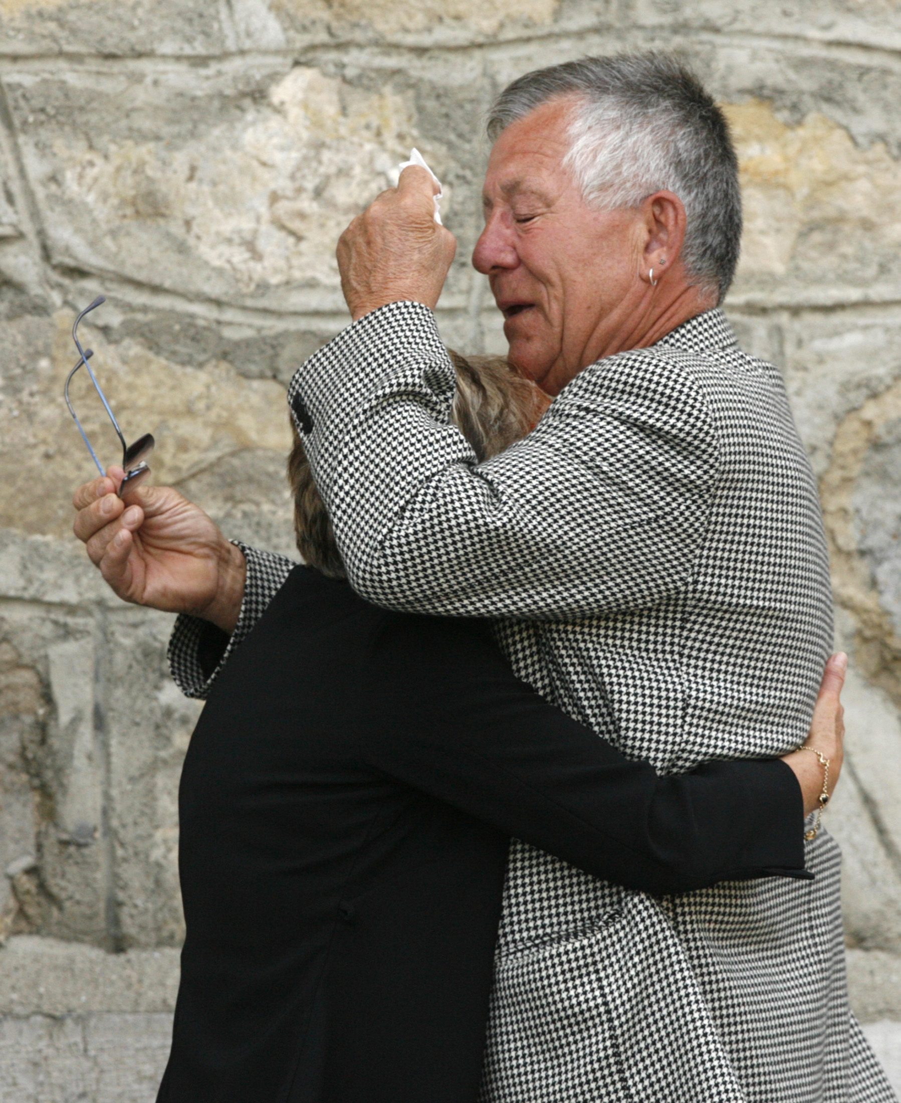 | An unidentified couple reacts outside the church before a ceremony for the victims of a coach crash in Allinges June 3, 2008. Seven children were killed when a train collided with a school bus at a level crossing in eastern France on Monday, French authorities said. [Agencies] |