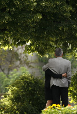 An unidentified couple reacts outside the church before a ceremony for the victims of a coach crash in Allinges June 3, 2008. Seven people were killed on Monday when a train collided with a school bus in eastern France near the border with Switzerland. [Agencies]