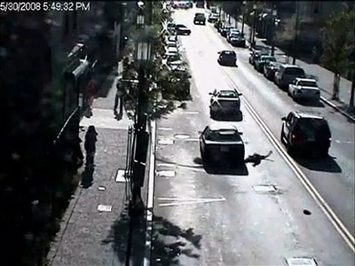 This image, provided by the Hartford Police Department and taken from a surveillance video, shows a man, lying in the street, center frame, just after a car hit him, Friday May 30, 2008. The 78-year-old man was tossed like a rag doll by a hit-and-run driver, and car after car zoomed by as he laid motionless on the busy city street. The victim, Angel Arce Torres, was in critical condition in Hartford Hospital. Authorities say he is paralyzed. [Agencies]