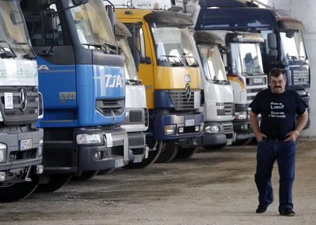A driver walks past trucks in a parking area during a strike in Carregado, on the outskirts of Lisbon, June 9, 2008. Truck drivers went on strike, with picket lines put up in some places around the country, prompting fears that if the strike goes on for long it will lead to shortages at markets and shops. The government issued a statement late on Sunday, appealing to truckers not to adopt positions that would "penalise the sector itself and the country." [Agencies]