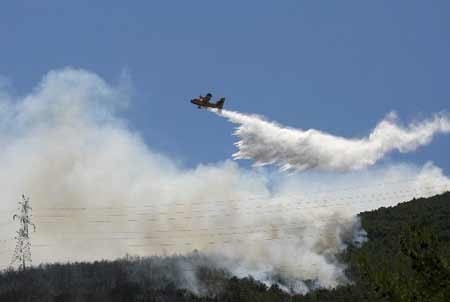 A fire-fighting airplane unloads water during a forest fire at the mountain of Hymettus, near Athens June 25, 2008. A forest fire near the Greek capital Athens forced power networks to shut down on Wednesday, causing blackouts, fire officials said. [Agencies] |