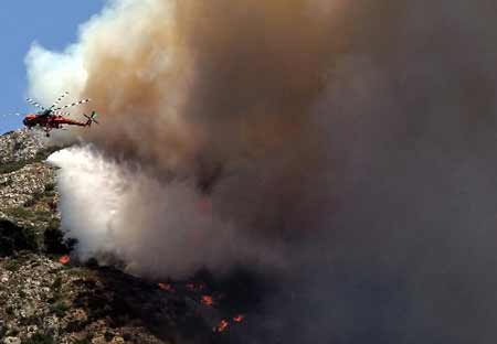 A fire-fighting airplane unloads water during a forest fire at the mountain of Hymettus, near Athens June 25, 2008. [Agencies]