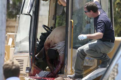 Updated: 2008-07-03 06:58 JERUSALEM - A Palestinian construction worker rampaged in a bulldozer along one of west Jerusalem's busiest streets on Wednesday, killing three Israelis as he crushed cars and overturned a bus before being shot dead. There was no claim of responsibility from militant groups and police said they were trying to establish if 30-year-old Hosam Dwayyat had acted alone. At his family home in the Arab east of the city, there was no sign of the crowds and banners that normally accompany the funerals of Palestinian guerrillas. A senior aide to Israeli Prime Minister Ehud Olmert, Vice Premier Haim Ramon, said the incident showed that some Palestinian areas like the one where Dwayyat lived should be separated from Jerusalem.