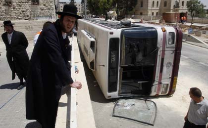 An ultra-Orthodox Jew stands near an overturned bus at the scene of an attack in Jerusalem July 2, 2008. A Palestinian rammed a bulldozer into Israeli buses, cars and pedestrians on one of Jerusalem's busiest streets on Wednesday, killing three people and wounding more than 40, emergency services said. [Agencies]