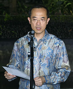 Singapore's Foreign Minister George Yeo reads a statement during an informal working dinner ahead of the Association of Southeast Asian Nations (ASEAN) Ministerial Meeting in Singapore July 20, 2008. [Agencies] |