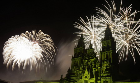 Fireworks explode over an ancient cathedral in Santiago de Compostela during celebrations for St James's Day in northwestern Spain July 25, 2008. [Agencies]