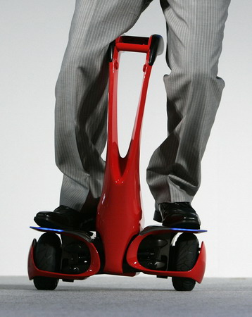 Updated: 2008-08-01 14:37 ![]() Toyota Motor Corp Partner Robot Division Project General Manager Yoshihiro Kawaharazaki demonstrates the company's Winglet "M" personal transport assistance robot in Tokyo August 1, 2008. The robots, which are under development and have a top speed of 6 km/h (3.7 mph), are designed to allow people to travel in an upright standing position with regular pedestrians. [Agencies] |