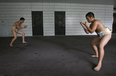 Boys attend a training session for the Wanpaku sumo-wrestling tournament in Tokyo August 3, 2008. About 400 elementary school boys took part in the competition. [Agencies]