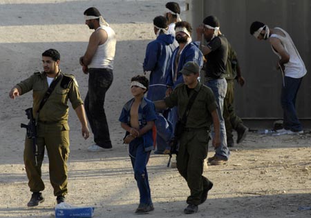 Israeli soldiers escort a blindfolded Palestinian boy, who fled to Israel from Gaza, at a military base near Kibbutz Nahal-Oz, just outside the Gaza Strip August 3, 2008. [Xinhua]