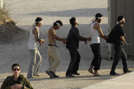 An Israeli soldier guards blindfolded Palestinian men, who fled to Israel from Gaza, at a military base near Kibbutz Nahal-Oz, just outside the Gaza Strip August 3, 2008. [Xinhua]
