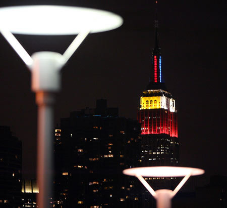 The tower of the Empire State Building is illuminated in New York, the United States, August7, 2008, to celebrate the 29th Olympic Games. The east and west sides of the building were lit in red and yellow in honor of China, while its north and south sides in red, white and blue in honor of the US. [Xinhua]