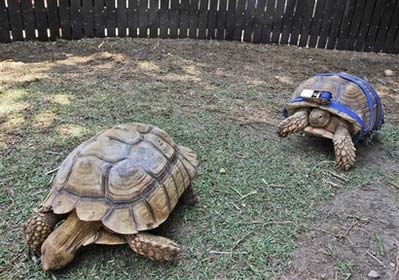 Arava, a disabled tortoise, right, crawls inside an enclosure with a custom skateboard attached to her shell that helps her move around, at the Biblical Zoo in Jerusalem, Tuesday, Aug. 18, 2008. [Agencies]