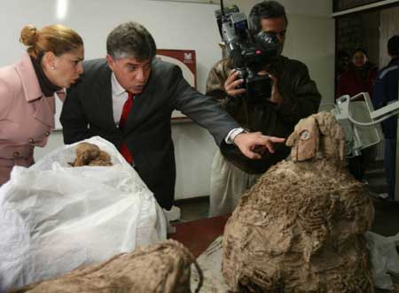 A female mummy wearing a mask is on show at a museum in Lima, Peru, Sept. 3, 2008. The 1,300-year-old mummy was found during the excavation of an ancient tomb in central Lima on Aug. 26. [Xinhua]