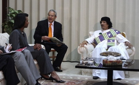 Libyan leader Muammar Gaddafi (R) meets with US Secretary of State Condoleezza Rice (L) in Tripoli September 5, 2008. Rice met Gaddafi -- once reviled as a "mad dog" by a US president -- on Friday on a historic visit which she said proved that Washington had no permanent enemies. [Agencies]