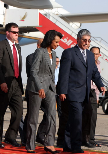 US Secretary of State Condoleezza Rice (C) arrives in Tripoli September 5, 2008. Rice met Libyan leader Muammar Gaddafi -- once reviled as a "mad dog" by a US president -- on Friday on a historic visit which she said proved that Washington had no permanent enemies. [Agencies]