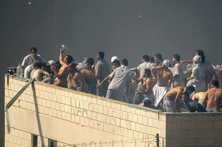 Prisoners on a roof throw stones during a riot at La Mesa jail in Tijuana in Mexico's state of Baja California September 17, 2008. Police said they have quelled a second riot in three days at the state jail in Tijuana. [Agencies]