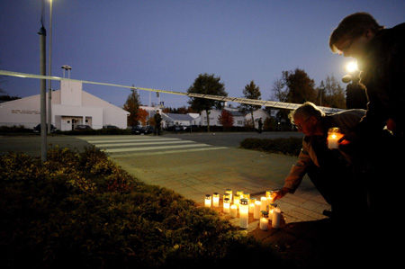 People place candles in front of the Kauhajoki vocational high school September 23, 2008. A student shot dead 10 people before shooting himself fatally at a vocational school on Tuesday, Finland's second such attack in less than a year and just one day after the gunman was interviewed by police over Internet postings. [Agencies]