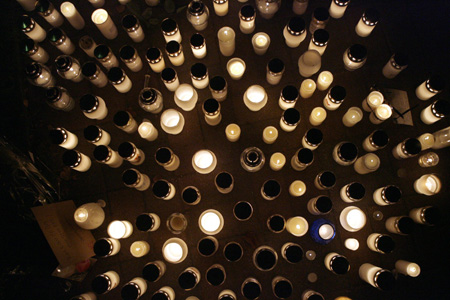 Candles are placed in front of a vocational school in Kauhajoki about 350 km (217 miles) from Helsinki September 24, 2008. A student shot dead 10 people before shooting himself fatally at a vocational school on Tuesday, Finland's second such attack in less than a year and just one day after the gunman was interviewed by police over Internet postings. [Agencies]