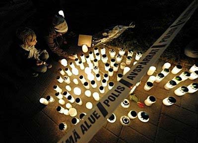 Students lay candles in the evening at the Kauhajoki vocational high school in Kauhajoki, southwestern Finland. [Agencies]