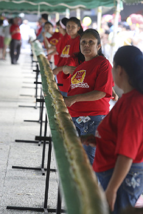 Volunteers wait next to a hot dog during an attempt to set the Guinness World Record for the largest hot dog, in Monterrey, northern Mexico September 27, 2008. The event was organized by local businesses with the support of the Monterrey city hall. The hot dog measured 76.23 meters (250 feet) and broke the previous record of 61 meters (200 feet) set in Japan. [Agencies]
