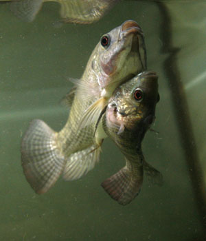 Two conjoined Nile Tilapia fish, dubbed "Siamese Twin", swim in a small aquarium in Bangkok October 3, 2008. They are both eight months old and share part of the skin together. The bigger fish tends to protect the smaller one from harm while the smaller one looks for food at the bottom of the aquarium. [Agencies]
