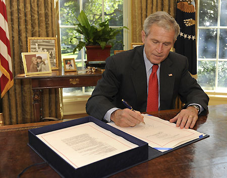 US President George W. Bush signs the Emergency Economic Stabilization Act of 2008 in the Oval Office after the House passed the $700 billion financial rescue legislation in Washington, October 3, 2008. [Agencies]